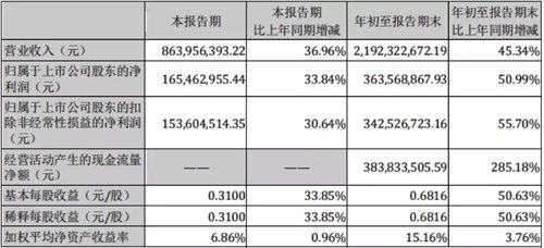答:營業收入21.92億元,同比成長45.34%;淨利潤3.64億元,同比成長50.99%,前三📐季度淨賺3.64億
